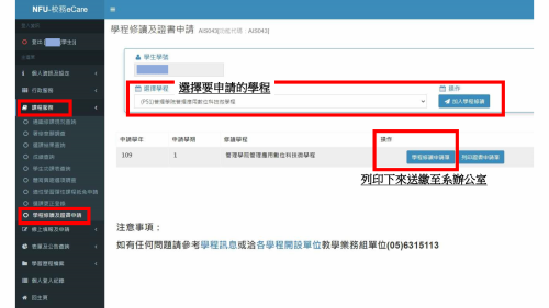 | 校務ecare | 選擇「學程修讀及證書申請」 | 選擇學程 | 列印「學程修讀申請單」 | 確認資料無誤後簽名,並送至學院審核 |