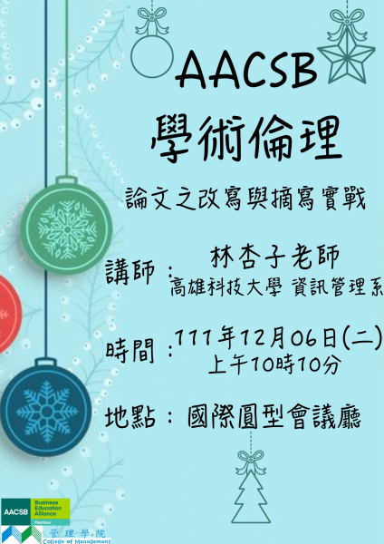【講座報名】學術倫理-論文改寫與摘寫實戰 2022-11-28 AdminAdmin 【講座報名】學術倫理-論文改寫與摘寫實戰 ★對於論文的寫作與專題寫作有疑問嗎? ☆對已經收集的到文獻不知道如何整理與彙整嗎? ★對資料的呈現是否擔心會有抄襲的疑慮呢? 各位同學有福了,本次管理學院邀請國立高雄大學-資訊管理系 林杏子老師,學術倫理領域的權威教師,來教導論文改寫與摘寫的方法與注意事項,歡迎有興趣的學生報名參加。 報名網址(iAct):https://reurl.cc/10vlqV